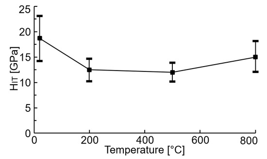After annealing at 200 °C, the HIT decreased to 12.5 ± 2.3 GPa (Figure 9). The hardness of the coating did not change after annealing the coated substrate at 500 °C. A slight increase in hardness to 15.0 ± 2.7 GPa can be spotted after annealing the coated substrate at 800 °C, which is more than in the case of WC/C coating deposited using the PE CVD method with added Ar (12.0 ± 0.8 GPa) and significantly more than in the case of added N2 gas (3.0 ± 0.2 GPa) [27].