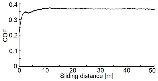 The COF values vs. the sliding distance of the tested WC/C coating.