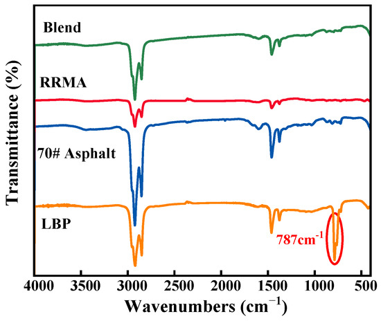 FTIR spectrum of LBP, 70# asphalt, RRMA and Blend.