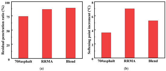 Aging indices of 70# asphalt, RRMA and Blend after TFOT aging: (a) residual penetration ratio; (b) softening point increment.