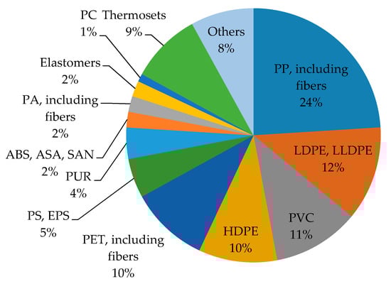 Based on its origin, polymeric waste may be derived from synthetic or natural sources generated from: (I) post-industrial waste and (II) post-consumer waste, which is an end-of-life product [7]. Polypropylene (PP), polyethylene (PE), poly(vinyl chloride) (PVC), polyethylene terephthalate (PET), polystyrene (PS), and polycarbonate (PC) are the most recycled synthetic polymers [23,24,25]. Recycling natural polymers and polymers from renewable resources such as cellulose, lignin, or poly(lactic acid) (PLA) has already been reported too.