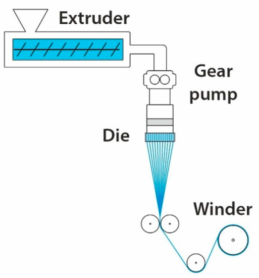 Melt spinning is a standard technique for fiber formation in the polymer industry. During this process, polymer pellets are heated to the proper temperature and extruded through micron-sized dies (orifices), and then rapidly cooled [92] (see Figure 7). This technique produces fibers with a diameter in the order of a few hundred micrometers; nevertheless, it can have several modifications in the cooling zone using air, such as melt-blown spinning. The melt-blowing process uses a high-velocity air jet to rapidly elongate a fine fiber with a submicron diameter [93]. The reduction of diameter depends on using the highest possible airflow rates, the diameter of orifices, spinning temperature, and extrusion rate [94]. There are many advantages of melt spinning, such as: (I) high production efficiency; (II) low cost and easy to implement large scale production; (III) ability to create controlled cross-sections of fibers (star shape, hollow and grooved fibers) [92]. The disadvantages are polymer thermal degradation and the impossibility of incorporating nanoparticles (metal, ceramic, carbon) into the polymer melt.