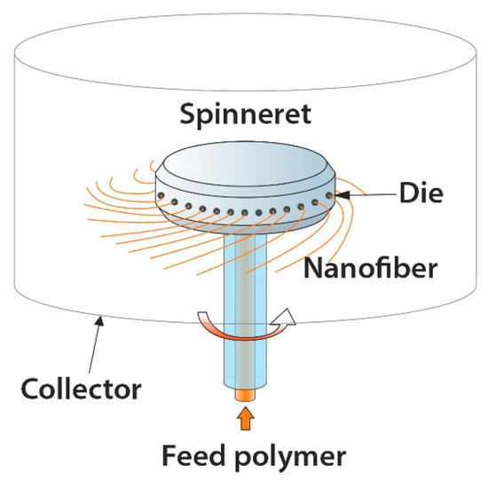 Centrifugal spinning is known in the two versions; first, it uses a heated spinneret that melts and elongates the polymer jet using centrifugal force, enabling nano- to the micro-fiber formation [100]. The sketch of this apparatus is shown in Figure 8. The second variant of this method used a polymer solution instead of a melt [101,102]. The fiber formation depends on the competition between the polymer jet’s viscous forces, surface tension, and applied centrifugal forces. The main process parameters include angular speed, viscosity, and surface tension, die radius and direction, chamber temperature, and distance to the collector [93,103].