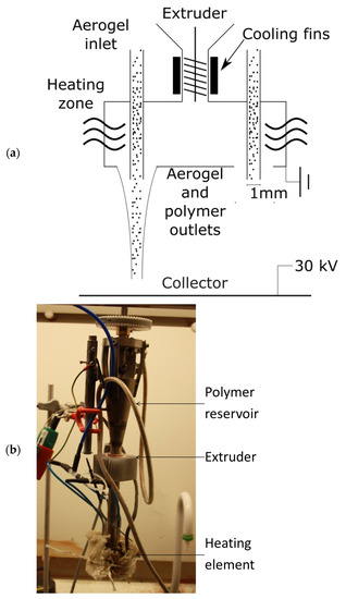 Polymer micro- and nanofibers can be created in several ways, and one fast and efficient process is electrospinning [1]. Electrospinning occurs when a droplet of fiber-forming solution or melt is placed in an electric field. As the field strength surpasses the surface tension, a Taylor cone emerges and a fiber emanates from the droplet [2]. The critical point of melt electrospinning occurs when the temperature of the melt is in a range above or equal to the glass transition temperature, but below the decomposition temperature [2]. The upper temperature limit of melt electrospinning is actually lower than the decomposition temperature for the polymer due to oxidation and the viscosity of the polymer melt. The process can be controlled through many parameters [3,4,5]. In the past, several efforts to electrospin advanced composite materials [6,7,8], and to upscale the process to an industrial scale [9,10], have been made. Among these types of advanced materials [8,11,12,13] are aerogel/polymer composite fibers, described earlier by this group [14,15]. Such materials allow for a combination of the incredible thermal insulation properties of silica-based aerogel and the mechanical strength and ease of handling of polymer fibers. So far, these fibers have been produced with organic solvents that are environmentally hazardous [16,17,18] and can compromise the properties of the aerogel [19]. Solvent-free production of aerogel composite fibers can enable their application in a whole range of new fields, including building insulation [20], high-performance clothing [21], aerospace suits [22], and the insulation of batteries in electric vehicles [23].
