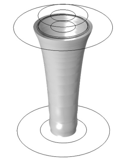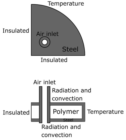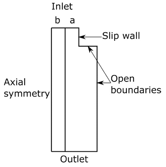 The simulations were carried out in a 2D axio-symmetric geometry (COMSOL Multiphysics 5.4), where two coupling terms were used to couple a two-phase flow with heat transfer in fluids. Figure 2 shows the simulation geometry. The inlet and outlet conveyed the molten polymer, the walls were set as an open boundary (to allow for airflow through the model) and a slip wall boundary condition. The model included heat transfer and a laminar two-phase flow with the applied body force due to the electrostatic force acting on the liquid. These were coupled so they would update material properties dependent on each other (thermal properties and viscosity). The coupling took place so that the thermal settings were resolved for a given time step, and the flow solver improved the temperature distribution. Subsequently, at the beginning of the next time step, the flow settings were imported by the thermal solver, ensuring an update of the material properties in a given region at all times.