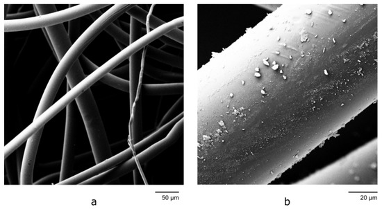 Fibers were produced from both PET and cellulose acetate butyrate, yielding diameters in the micrometer range. Figure 4 shows representative images of polymer fibers Figure 4a), and composite fibers (Figure 4b). The two polymer types were both spinnable, but cellulose acetate butyrate showed thermal degradation at all temperatures with spinnable viscosity (150 °C and above). The PET fibers had small mean diameters and a stable electrospinning rate at 300 °C and a 7.4 cm spinning distance. Hence, these were chosen as the spinning parameters for further pneumatic experiments. All fibers had small, uniform diameters at high temperatures and smaller distances, but both the diameter and the variance increased with greater distances and lower temperatures. All spinning was stable at the chosen distance, but at greater distances, it tended to destabilize. The upper and lower distances mark the maximal and minimal spinning distance, respectively, where stable spinning could be maintained. Further details are shown in Table 2.