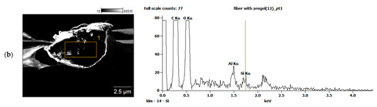 The pure PET fibers exhibited a smooth surface, while the aerogel exhibited small particles on the composite fibers’ surface. This was also confirmed by EDX measurements of an aerogel-containing fiber, proving that the silica aerogel particles are both present on the surface and inside the fiber (Figure 5). This suggests that the aerogel particles are intermixed well with the polymer and were encapsulated in a polymer matrix within the fiber. It should be noted that unstable spinning at high airflow rates and low aerogel incorporation at low airflow rates place some limitations on the aerogel content of the fibers in the experimental setup used.