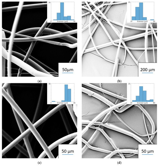 The mean size of the produced fibers without added aerogel varied between 12.4 and 91.2 µm for PET fibers, and 22.2 m and 39.0 µm for cellulose acetate butyrate fibers, depending on distance and temperature. Table 2 shows the average fiber diameters and standard deviations for all the experimental series for pure polymer fiber spinning. The table shows that spinning at a lower distance produced thinner fibers due to a higher electrostatic pulling force. Furthermore, increasing temperature also led to a decrease in the fiber diameters for both materials due to a reduction in viscosity. Figure 6 shows the fibers and their size distribution for all samples spun at 300 °C. This temperature and the distance of 7.4 cm were chosen for the spinning of aerogel-containing fibers, as they produced thin fibers with a narrow size distribution. The electrospinning at 320 °C produced thinner and more uniform fibers but did show signs of thermal degradation (fiber discoloration). Electrospinning of PET at temperatures below 280 °C was not possible due to high viscosity. Therefore, the spinnable range of non-degraded PET polymer fibers is between 280 and 300 °C.