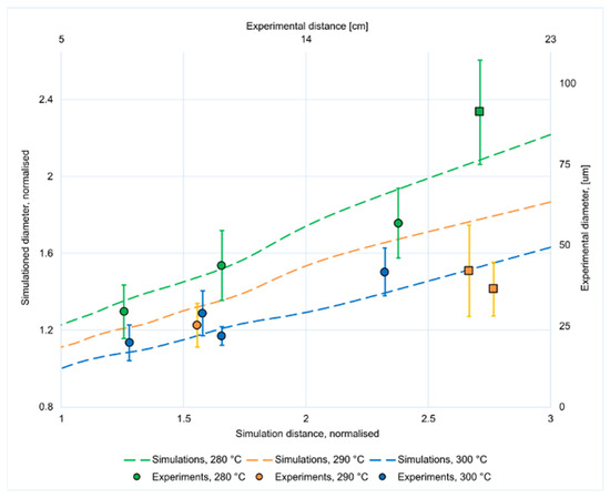 Simulated (lines) and measured (points with error bars) diameters for electrospun fibers at different distances and temperatures. Simulations are normalized and square data points mark unstable spinning conditions.