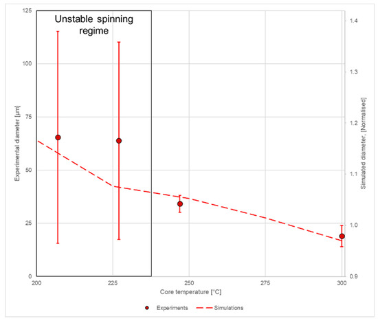 Figure 9 shows the relationship between the measured and simulated diameters for the composite fibers. While the low-airflow experiment (30 mL/s, 247 °C) yielded uniform fibers with a small diameter variation (34 ± 4 µm), the high-airflow experiments (40–50 mL/s, 227 and 207 °C) showed instabilities, yielding very high variance in the fiber diameter (64–65 ± 46–50 µm). The applied method was found to produce aerogel-containing fibers, and the modelling approach was able to reproduce the experimentally observed trend within the stable spinning region.