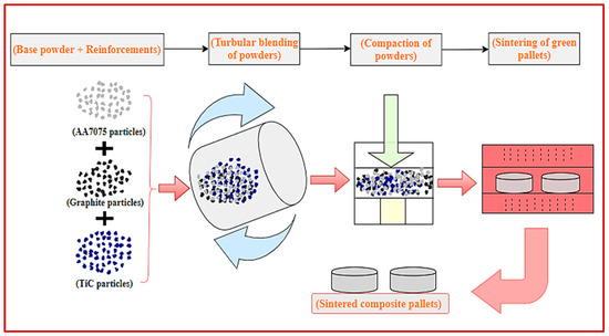 In the present study, a green fabrication process, i.e., the powder metallurgy (PM) technique, was adopted for the synthesis of composites. Five different combinations of composites were synthesized by the PM process, as depicted in Table 2. The matrix and reinforcement powders were mixed using Turbula mixing. The schematic diagram for the synthesis of composites in various stages is illustrated in Figure 1. The main steps of producing composites were mixing elemental powders in a Turbula mixer (Shanghai, China), drying of the mixed powder in vacuum oven, compaction of powder, and sintering of compact pallets.