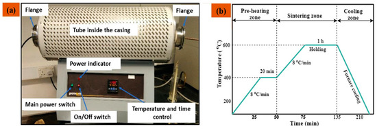 The fabricated green pellets of Al 7075 and Al 7075/Gr/TiC hybrid composites were pressurelessly sintered in a nitrogen environment for 2.25 h in the tube furnace (Protherm, PTF12/75/800, Ankara, Turkey) as shown in Figure 3a. The heating rate was maintained a 8 °C/min, and the sintering temperature and dwell time were kept 500–600 °C and 1 h, respectively, for all samples. The cooling of samples to ambient temperature was done in the furnace as depicted in the sintering cycle illustration (Figure 3b).