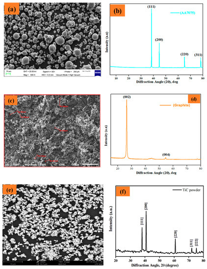 The powder morphology and X-ray diffraction peaks of the as-received pure Al 7075, particles of graphite and TiC powders are illustrated in Figure 4a–e. The Al 7075 powder particles are spherical, with few particles of irregular shape (Figure 4a). The graphite particles morphology is illustrated in Figure 4c, the particles are irregular in shape with an average particle size of approximately 38 µm. The TiC powders (<800 nm) have an irregular shape and were agglomerated (Figure 4e).