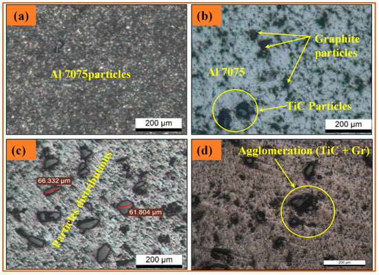 Figure 5 shows optical microscopy images of the matrix Al 7075 and all the synthesized composite samples. As observed from the image of Al 7075, no pores are present in the microstructure (Figure 5a). The grain boundaries are visible along with the particle distributions of the reinforcements within the matrix Al 7075 (Figure 5b). An optical micrograph of a hybrid composite with 3 wt.% TiC is shown in Figure 6c, where a slight agglomeration is observed for the graphite particles. Refinement of grains is also observed. A higher level of agglomeration is exhibited in the 7 wt.% TiC hybrid composite sample. The distributed nature of the reinforcement plays a decisive role in the enhancement of the physical and mechanical behavior of the produced composites [34].