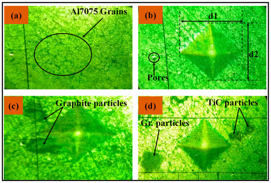 Optical micrograph of Al 7075 (a) before hardness test; (b) Indentation image after hardness test; (c,d) Indenter impact on Al 7075/Gr and Al 7075/Gr/TiC composites surface, respectively.