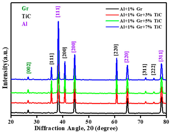 The X-ray diffractometry technique was used to determine the phase identification and confirm of the existence of reinforcing particles (Gr and TiC) in the sintered composites. Figure 7 shows the X-ray diffraction (XRD) patterns of produced Al 7075/Gr composites and Al 7075/Gr/TiC hybrid composites with varying percentages of graphite.