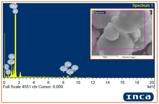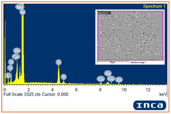The energy dispersive spectroscopy (EDS) analysis of the matrix powder Al 7075 (Figure 8) confirmed the presence of all the major alloying elements (Zn, Mg, and Cu) in the Al 7075 alloy powder, however, alloying elements of less than 0.1 wt.% are not detected in the image due to their low content. It is also observed that a small peak of oxygen is present in the Al 7075 EDS spectrum. The EDS analysis of hybrid composites (Al 7075 + 3 wt.% TiC + 1 wt.% Gr) was done to validate the presence of the Al 7075 matrix and TiC and graphite reinforcements within the developed hybrid composites (Figure 9). It is observed that the spectrum of Al, Ti, and C peaks confirms the presence of Al, TiC, and graphite in the sintered hybrid composite samples.
