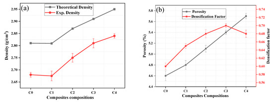 The variation of theoretical and sintered density of Al 7075/TiC/Gr composites is depicted in Figure 10a. The theoretical density (TD) signifies the density of composites with no cavities, i.e., the highest densification in the theoretical state, it is substantially higher than the experimental density. It is observed that the theoretical density of Al 7075/graphite composites (sample C1) slightly decreases as compared to neat aluminum (sample C0). The calculation of TD of composites has been done by the rule of mixtures, and the decline in the theoretical density of composite is attributed to the lower density of graphite as compared to aluminum. It is clear from the theoretical density curve (Figure 10a) that the addition of TiC particles to the aluminum matrix improves the density of the hybrid composites (samples C2, C3, and C4) because the TiC particles possess higher density than the aluminum matrix. An approximate linear drop in the experimental densities is observed (Figure 10a), the decrease in the experimental density is attributed to the presence of pores. Similar findings were observed in the literature [51].