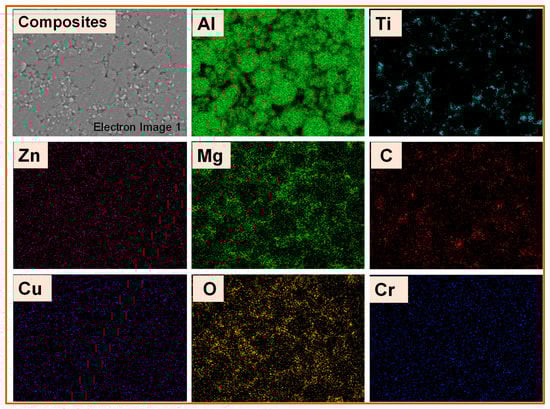 Elemental maps of Al 7075 + 3 wt.% TiC + 1 wt.% Gr hybrid composites.