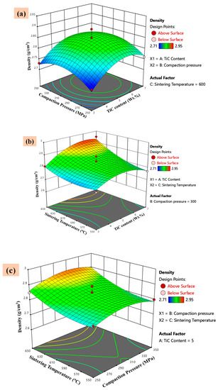 Analysis of variance (ANOVA) and a lack of fit test (LOF) was performed to justify the model’s adequacy. According to results of the ANOVA analysis (Table 7), the model regression coefficient of determination (R2) of 0.9295 for sintered density was in good agreement with the experimental outcomes, indicating that the model can explain 92.95% of the variability, leaving 7.05% residual variability for output (density). The design model’s final quadratic equation (Equation (3)) with the three independent variables and dependent response (density) can be represented as: