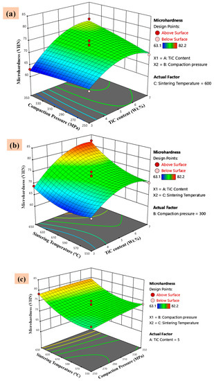The statistically significant terms are observed to be A (TiC content), C (sintering temperature), AB (interaction of TiC content and compaction pressure), AC (interaction of TiC content and sintering temperature), A2 (quadratic term of TiC content), and B2 (quadratic term of compaction pressure). The relatively high influence of reinforcement content on the microhardness of the analyzed specimens is consistent with a few previous investigations [54]. The lack of fit F-value of 1.19 implies the lack of fit is not significant relative to the pure error. There is a 41.93% chance that a lack of fit F-value this large could occur due to noise. Non-significant lack of fit implies that the contribution of the chosen variable is adequately high for producing the full model, and thus it is recommended. Thus, the achieved outcomes are in good agreement with previously reported literature [34,45]. The correlation coefficient (R2) of 0.9692 indicates that the model developed is accurate and closely fits the experimental data. The adjusted R2 of 0.9296 is reasonably close to the predicted R2 of 0.8420. The difference between adjusted R2 and predicted R2 was obtained to be 0.08, which is inside the acceptable range (<0.2) for a developed model. The predicted R2 indicates how well the developed model responds to new observations and whether the model is simple or complicated. As a result, in statistics, adjusted R2 and predicted R2 are more desirable attributes for the goodness of fit. In the present study, all the R2 characteristics were near to 1, implying that the data and models generated were incredibly significant.