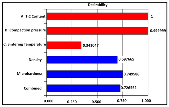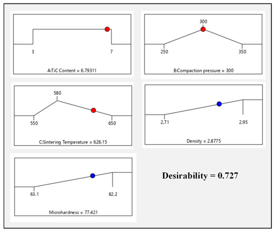 A set of five optimal solutions is derived for the given input constraints for density and microhardness using the Design-Expert software as given in Table 9. The optimal solution for the desired response is chosen from a range of conditions with the highest desirability value. Table 9 depicts the ideal set of conditions with the highest desirability function. As it is observed from the ramp function graph (Figure 15), the TiC concentration of 6.79 wt.%, compaction pressure of 300 MPa, the sintering temperature of 626 °C are the optimum process variables used to get the enhanced density 2.87 g/cm3 and microhardness 77.42 VHN of the synthesized composites. The desirability, in general, varies from 0 to 1 depending upon the closeness of the output to the set target.