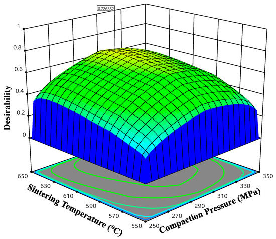 It is evident from the plot that the optimum conditions are desired at the compaction pressure range of 290–310 MPa and sintering temperature range of 610–630 °C at the constant TiC 6.79 wt.% with desirability varying between 0.625–0.727. This shows that the optimum parameters (i.e., maximum density and microhardness) might be attained within the parameters mentioned above