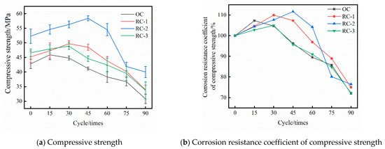 The compressive strength of OC and RC and the corrosion resistance coefficient of compressive strength under dry–wet alternation in the chloride salt erosion environment. (a) Compressive strength, (b) Corrosion resistance coefficient of compressive strength.