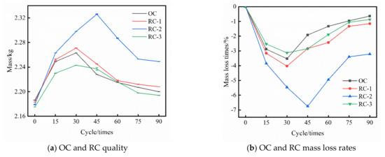 Mass and mass loss rate of OC and RC under dry–wet alternation in the chloride salt erosion environment. (a) OC and RC quality, (b) OC and RC mass loss rates.