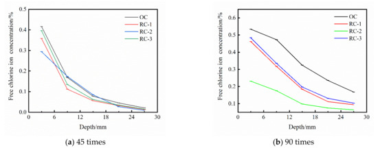 The free chloride ion concentrations of OC and RC at different depths are shown in Figure 3 at 45 and 90 times of dry–wet alternation. It can be seen intuitively: (1) The free chloride ion concentration in OC and RC specimens decreases with the increase in depth under the action of dry–wet alternation in chloride salt erosion environment. (2) The free chloride ion concentration in RC specimens decreased compared with OC specimens.