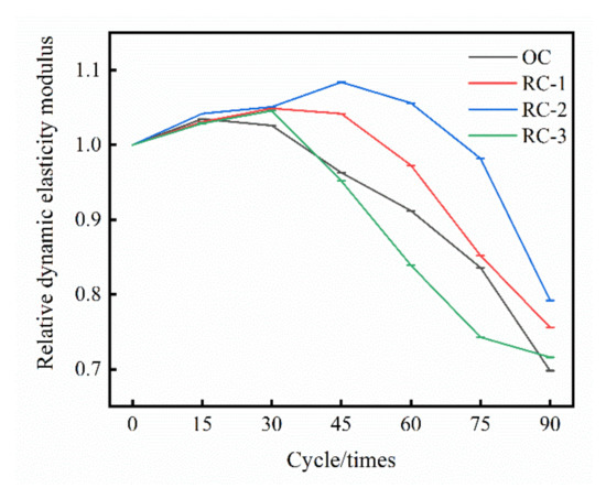 It can be seen from Figure 4 that, compared with OC, the relative dynamic elastic modulus of RC increases faster in the initial stage, and decreases slowly in the later stage of the dry–wet alternation. This indicates that mix rubber into the concrete is beneficial to reduce the pores in the concrete, enhance the compactness of the concrete, and enhance the ability of concrete’s anti-chloride salt corrosion. When the dry–wet alternation reaches 15 times, the OC dynamic elastic modulus reaches the peak value, increasing by 3.5%; when the dry–wet alternation reaches 30 times, the dynamic elastic modulus of the RC-1 group and the RC-3 group reached the peak value, increasing 4.9% and 4.6%, respectively; when the dry–wet alternation reaches 45 times, the dynamic elastic modulus of the RC-2 group reached the peak value, an increase of 8.4%. It can be seen that the R-2 group of specimens has the smallest degree of degrading and damage under the dry–wet alternation action in a chloride salt corroded environment.