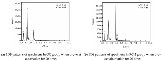 The EDS patterns of the specimens in the OC group and the RC-2 group are shown in Figure 7 when they are corroded by chloride salt for dry–wet alternation for 90 times. It can be seen from Figure 7 that the chloride element in the RC-2 group is significantly lower than that in the OC group. This is because the rubber is mixed into the concrete effectively improve the binding capacity of concrete to chloride ion and reduces the chloride ion concentration in the concrete.