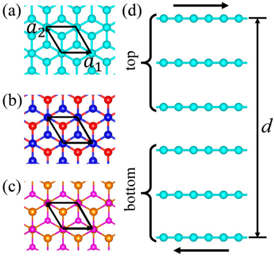 Top views of atomic structures of: (a) graphene, (b) h-BN, and (c) MoSe2 with AB stacking. (d) Side view of a 6L-layer graphene. The cyan, blue, red, gold, and pink balls are C, N, B, Mo, and Se atoms, respectively. Here a1 and a2 are two lattice vectors of the unit cell, respectively, and d is the interlayer distance between the top and bottom layers.