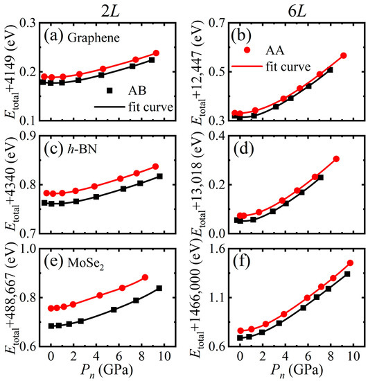 The total energies (in unit of eV) and corresponding fitting curves with normal pressure for 2L- and 6L-layer: (a,b) graphene, (c,d) h-BN, and (e,f) MoSe2 with AB and AA stacking.