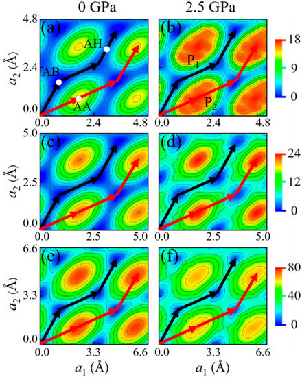 PESs (meV) of 2L-layer: (a,b) graphene, (c,d) h-BN, and (e,f) MoSe2 under the normal pressures of 0 and 2.5 GPa. The black and red lines denote the lowest and highest sliding energy paths, respectively.