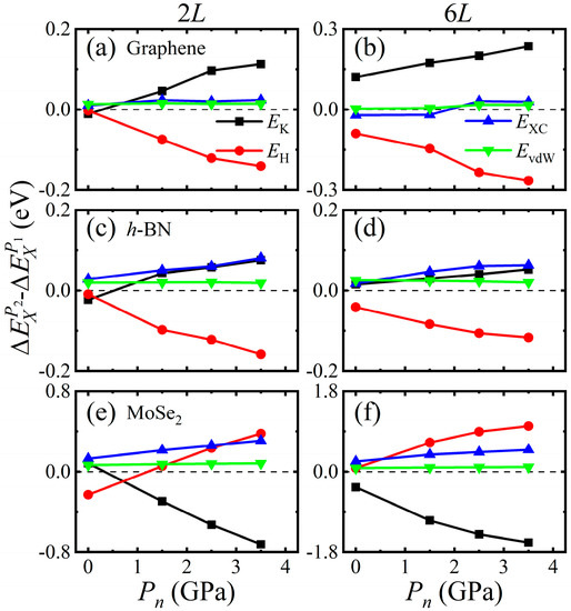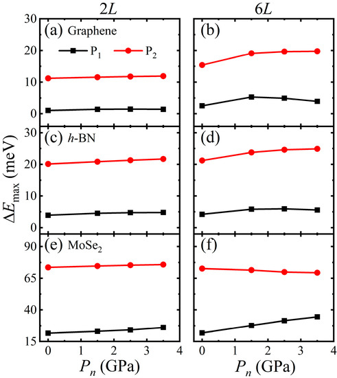 The variations of and with normal pressure for 2L- and 6L-layer: (a,b) graphene, (c,d) h-BN, and (e,f) MoSe2.