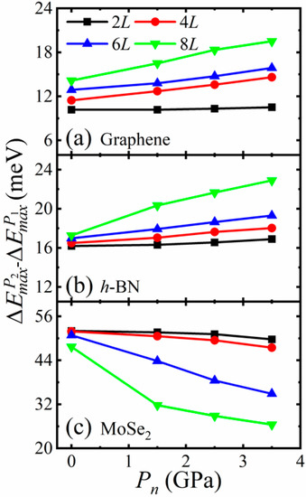 The variations of with normal pressure for 2L- and 6L-layer: (a,b) graphene, (c,d) h-BN, and (e,f) MoSe2.