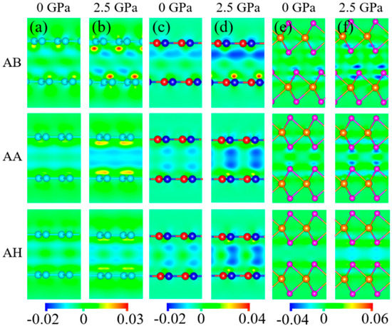 2D projections of interlayer charge density differences (in unit of ) for 6L-layer: (a,b) graphene, (c,d) h-BN, and (e,f) MoSe2 with AB, AA, and AH stacking under the normal pressures of 0 and 2.5 GPa.