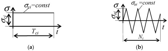 The levels of total damage different from unity confirm the influence of the sequence of the type of load on durability. The damage values also indicate that the linear model of damage summation under conditions of alternating creep and fatigue load results in qualitatively different lifetime predictions, depending on the load sequence. In the case of the (f-c) program, the durability obtained from simplified calculations is lower than that obtained from tests ( > 1), so the lifetime predictions are underestimated. However, under the conditions of the (c-f) load sequence, the durability from calculations is higher than that from the tests ( < 1), so it is overestimated.