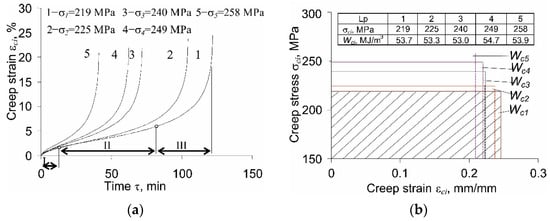 Figure 3b), the influence of the stress level on its value is even less pronounced; the values of creep strain energy at the five stress levels