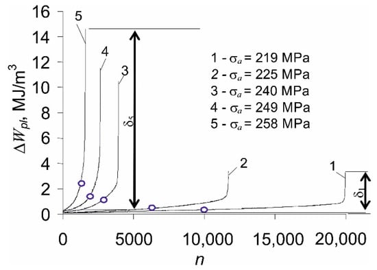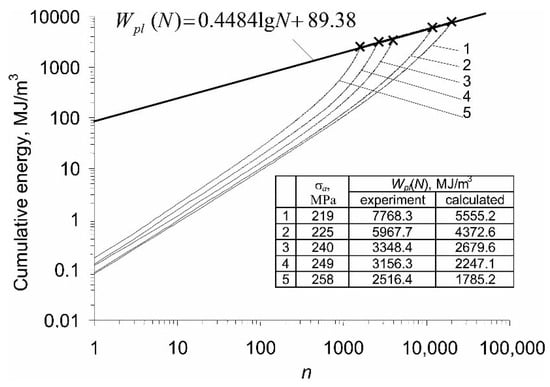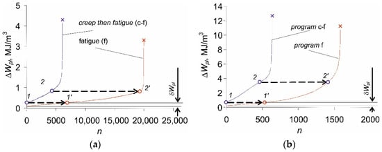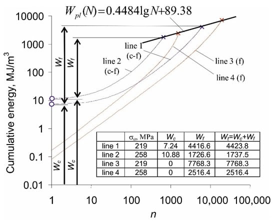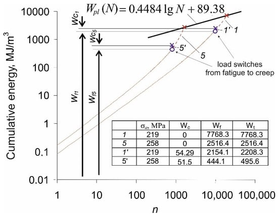 Figure 8. In the points indicated in the figure, the load switches from fatigue to creep, and the cumulative energy paths switch from 1 to 1’, and from 5 to 5’. As a result, the critical values of the total accumulated energy at failure are much lower than in the case of a pure fatigue load test.