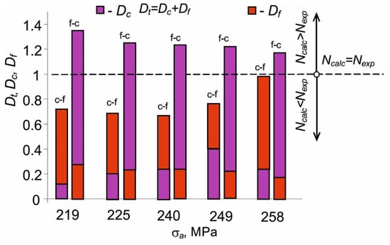 Table 2 reveals that, according to the summation hypothesis (6), the fatigue loads have a dominant effect on the durability of the samples during the (c-f) program variant (
