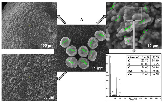 The surface morphology and elemental composition of the synthesized Saccharomyces cerevisiae/calcium alginate beads were examined before and after the biosorption process by using a scanning electron microscope (SEM Quanta 200 3D (FEI Europe B.V., Eindhoven, Netherlands)) equipped with an energy-dispersive X-ray system. The dried beads (50 °C, 2 h in an Air Performance AP60 hot air oven, (Froilabo, Paris, France) were fixed to stubs with double adhesive carbon discs. The analyses were carried out in normal secondary electron mode (SE) in low vacuum. The detection was ensured by a large field detector (LFD) at an accelerating voltage of 20 kV, a working distance of 15 mm and a spot size of 5. The magnification range was between 1 mm and 10 µm.