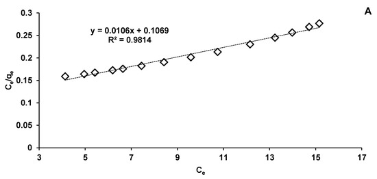 In terms of equilibrium isotherms, Langmuir (Equation (5)) and Freundlich (Equation (6)) ones were considered to investigate the CPX biosorption on the prepared biosorbent.