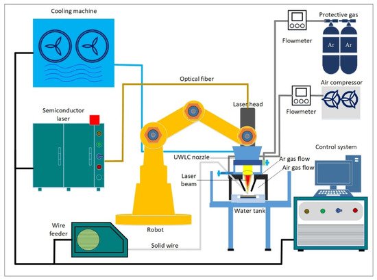 As shown in Figure 1, the UWLC experiment system was mainly composed of a semiconductor laser, a six-axis robot, a laser cladding nozzle, a wire feeding system and a gas delivery system. The maximum output power of the laser was 5 kW, the wavelength was 915 nm, and the core diameter of the fiber was 800 µm. Laser cladding nozzle was divided into the inner layer and outer layer. In the outer layer, compressed air was passed into the outer layer to discharge water to form a local dry space, and in the inner layer, argon was passed into the inner layer to discharge air to create a protective atmosphere. In order to make the laser cladding process more stable, the front-feed wire method was adopted in this paper. Compared with the post-feed wire and the side-feed wire method, the front-feed wire method had better adaptability to the fluctuation of the metal wire [22,23]. The wire feeding angle was 30°, which could ensure the wire and workpiece absorbed enough energy at the same time. When the distance between the light and wire was set to 0, the melted metal wire could enter the molten pool in the way of liquid-bridge transition, which could reduce the influence of wire fluctuations on cladding stability.