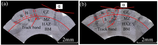 The underwater and in-air cladding appearances of multiple-track cladding layers are shown in Figure 3. The uniformity of underwater cladding layers was poor, and the surfaces were rough, while the surfaces of in-air cladding layers were smoother, and the uniformity was better. The underwater and in-air transverse sections of multiple-track cladding layers are shown in Figure 4. For both samples, excellent metallurgical bonding was obtained between the multiple-track cladding layers and base metal, and no cracks and pores were observed under the optical microscope, indicating that reliable multiple-track cladding layers were formed on the base metal in the underwater environment. Both in the underwater and in-air multiple-track cladding layers, the cladding regions were uneven, and gaps and track bands between the adjacent cladding tracks were found. However, compared to the in-air multiple-track cladding layers, the underwater multiple-track cladding layers were more uneven, and the gaps and track bands were more obvious. During the multi-channel laser cladding process, the filler wire and base metal were melted or the cladding layers were remelted under the action of the laser beam. Therefore, the multi-channel laser cladding layers could be divided into five regions based on the thermal cycle in the process of multi-channel laser cladding and different material sources [26]. They were, respectively: the cladding zone (CZ), which was areas formed by the melting metal wire deposited on the base metal or other cladding layers; the melting zone (MZ), referring to the melting metal of the substrate; the heat-affected zone (HAZ), which was influenced by the molten pool; the base metal (BM); and the overlapping zone (OZ), referring to the cross areas of adjacent cladding layers. To further describe the geometry of the cross section, the thickness of the CZ (H, μm), the depth of the MZ (h, μm), the width of the CZ (W, μm), the width of the track band (w, μm) and the angle between adjacent CZs (α, °) were measured, and the dilution rate (D) and the shape factor (S) were evaluated [15]: