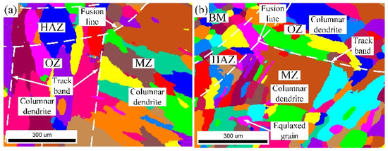 The grain morphology near the in-air and underwater fusion line is shown in Figure 8. Part of the grains in the HAZ grew through the fusion line to the MZ, which indicated that there was an obvious co-crystalline relationship between the HAZ and MZ. The grain was ununiform, and some small grains formed inside the large grains in both the in-air and underwater MZs. The distribution of grain sizes in the in-air and underwater OZs and MZs is shown in Figure 9 and Figure 10. The maximum grain size in the in-air OZ and MZ was 187 µm and 226 µm, and the average grain size of the OZ and MZ was 139 µm and 168 µm, while the maximum grain size in the underwater OZ and MZ was 165 µm and 230 µm, and the average grain size of the OZ and MZ was 118 µm and 128 µm. The cool rate of the water environment was faster than that of the air; in addition, the underwater peak temperature was lower than that of in-air, and therefore, the underwater grain size was smaller.