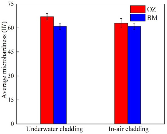 The average microhardness values of the underwater and in-air OZ are shown in Figure 13. The average microhardness value of the underwater OZ was 67 HV, while the average microhardness value of the in-air OZ was 63 HV. It could be found that the underwater average microhardness value was higher than that of in-air. On the one hand, increasing temperature led to the formation of more precipitates at the matrix and grain boundaries, which would increase the microhardness of material. On the other hand, the increase in temperature also made the grain grow. According to the Hall–Petch theorem, the average microhardness value would decrease. It could be seen from the results that the combined actions made the in-air microhardness of material decrease.