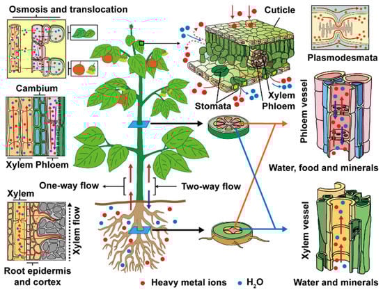 However, in the case of hyperaccumulators, metal ion transport occurs by bulk flow in the xylem from root to shoot by complex formation with chelators []. Heavy metal complexes are translocated to the neighboring cells step by step by plasmodesmata or transporters on the plasma membrane from the root symplast into the xylem apoplast. In this saturable process, the number of transport proteins (Table 1), as well as the rate of transport, substrate affinity, and substrate specificity of variation in the transporters, are the main limiting factors [].