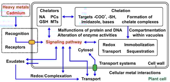 The nutrients required by plants in the greatest amounts are N, P, and K. For this reason, they are often considered the most important; N and P as components of proteins and nucleic acids. The essential heavy metals, such as Fe(II), Cu(II), Zn(II), Ni(II), Co(II), Mo(II), Mn(II), and Se(IV,VI), play a crucial regulatory role in the series of cellular reactions, including electron transfer, enzyme activation, redox reactions, and pigment synthesis. However, Pb(II), Cr(III), Cd(II), Hg(II), and As(V) are not required in any biological reactions and cause toxic effects []. Except for the physiological defensive mechanisms against damage by heavy metals (sequestration, compartmentalization, exclusion, and inactivation), plants can also induce antioxidant systems and maintain metal homeostasis by limiting the bioavailability of metals []. The essential processes: uptake, translocation, detoxification, and accumulation of heavy metals are controlled by physiological and molecular complex regulatory mechanisms (Figure 2). For instance, transporters for Zn(II) and Ca(II) can take up Cd(II) [], and transporters for phosphate can also absorb arsenate [].
